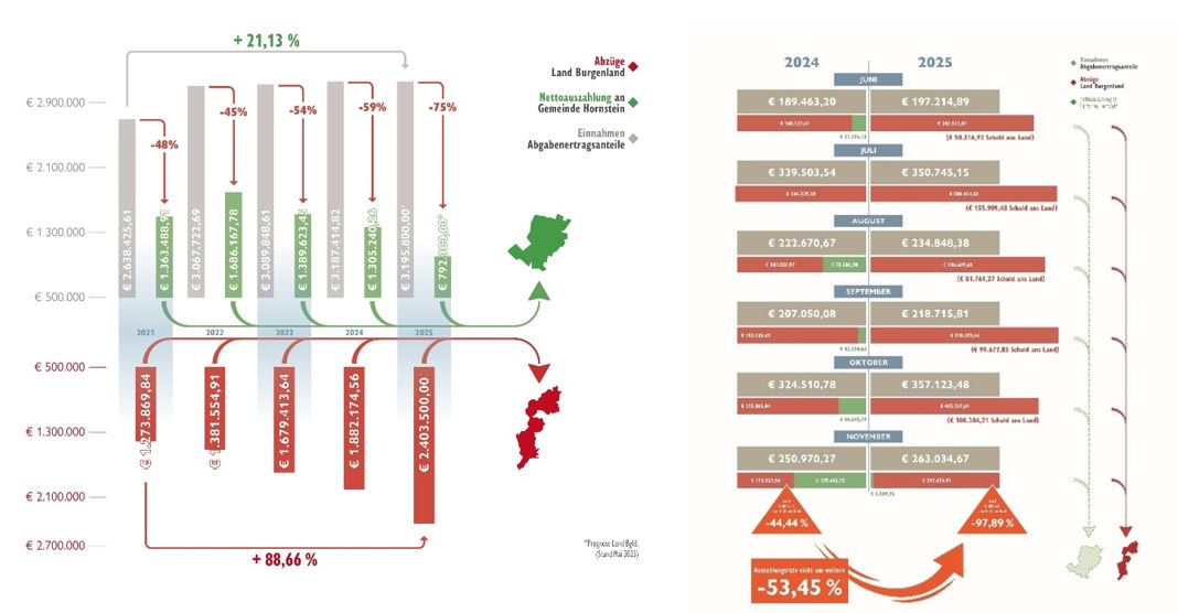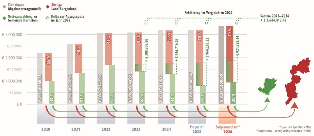 Die Ertragsanteile des Bundes für die Marktgemeinde Hornstein steigen im Jahr 2026 um rund 6 % auf 3.377.300 Euro. Gleichzeitig erreichen die Abzüge des Landes – bereinigt um den Pflegefonds – ein Rekordniveau von 2.445.700 Euro, was einem Einbehalt von knapp 72 % entspricht. Damit wird eine seriöse Finanzplanung erheblich erschwert.