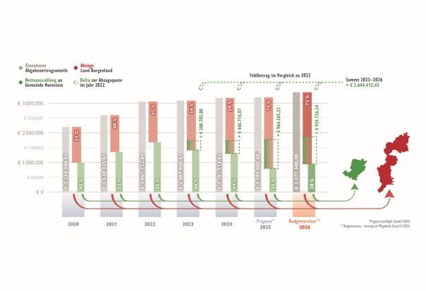 Die Ertragsanteile des Bundes für die Marktgemeinde Hornstein steigen im Jahr 2026 um rund 6 % auf 3.377.300 Euro. Doch die Freude währt nicht lange: Die Abzüge des Landes erreichen ein nie dagewesenes Niveau (bereinigt um den Pflegefonds) von 2.445.700 Euro. Damit behält sich das Land erneut knapp 72 % der Mittel ein – ein Wert, der jede seriöse Finanzplanung zunichtemacht.