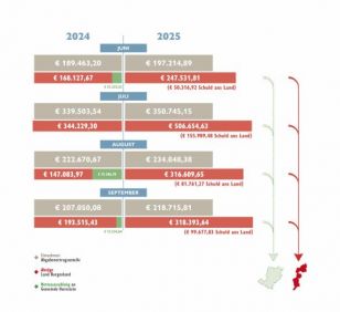 „Eigentlich hätte unsere Gemeinde im September rund 235.000 Euro an Bundesertragsanteilen erhalten sollen – doch das Land zieht vorab weit mehr als diesen Betrag ab. Unterm Strich bleiben null Euro – und wir sind mittlerweile wieder knapp 100.000 Euro im Minus. Ein völlig absurder Zustand!“, erklärt Bürgermeister Christoph Wolf. Im Vorjahr lag die Gesamtauszahlung von Jänner bis September noch bei rund 840.000 Euro. Abzüglich der aktuellen Nachforderung hat die Gemeinde im Jahr 2025 weniger als die Hälfte dieses Betrags erhalten.